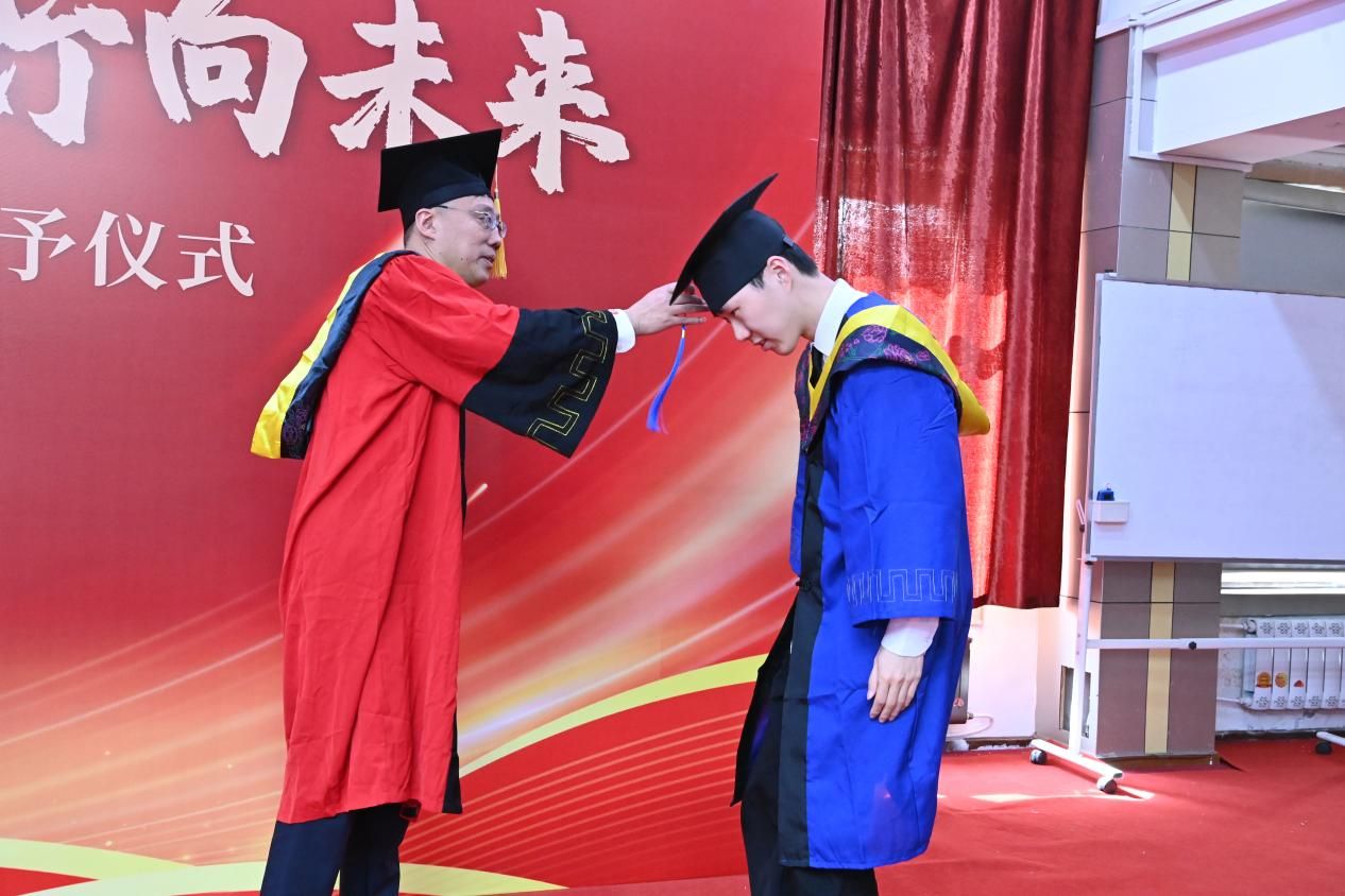 典礼将近尾声,拨穗正冠仪式正式开始。同学们纷纷上台,领取证书,并与老师们合影留念。老师和学生们脸上都洋溢着温暖的笑容,这份感动和温馨将成为毕业生们永远难忘的记忆。