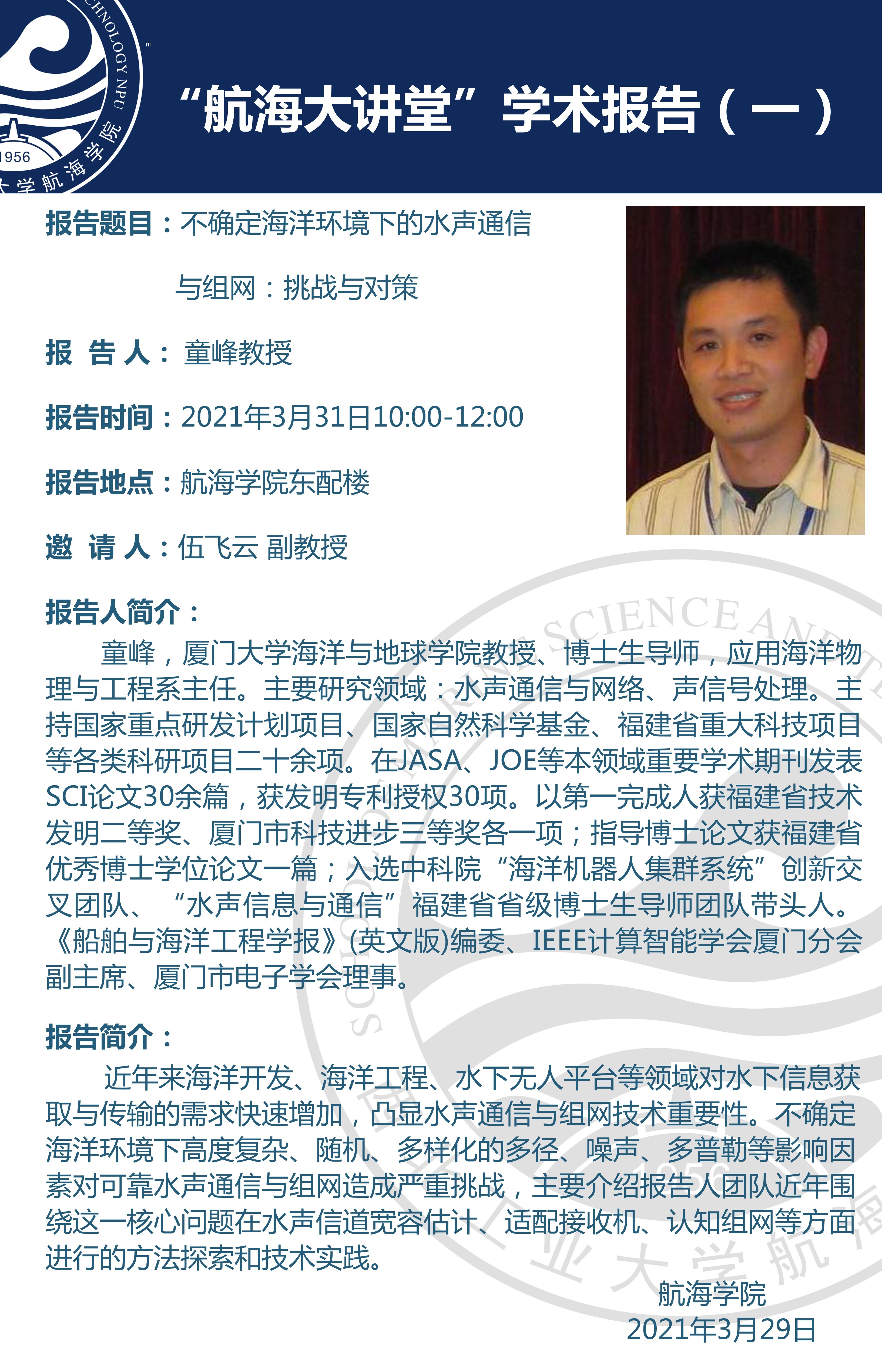 报告人简介:童峰,厦门大学海洋与地球学院教授、博士生导师,应用海洋物理与工程系主任。主要研究领域:水声通信与网络、声信号处理。主持国家重点研发计划项目、国家自然科学基金、福建省重大科技项目等各类科研项目二十余项。在JASA、JOE等本领域重要学术期刊发表SCI论文30余篇,获发明专利授权30项。以第一完成人获福建省技术发明二等奖、厦门市科技进步三等奖各一项;指导博士论文获福建省优秀博士学位论文一篇;入选中科院“海洋机器人集群系统”创新交叉团队、“水声信息与通信”福建省省级博士生导师团队带头人。《船舶与海洋工程学报》(英文版)编委、IEEE计算智能学会厦门分会副主席、厦门市电子学会理事。