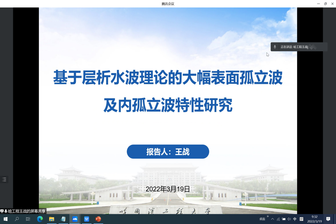 3月19日,应永利集团官网杜鹏副教授的邀请,哈尔滨工程大学船舶工程学院和哈尔滨工程大学青岛创新发展中心联合博士后王站,在线上为学院师生作“航海大讲堂”系列讲座(十四)——《基于层析水波理论的大幅表面孤立波及内孤立波特性研究》的学术报告。会议由杜鹏副教授主持,学院10余名师生参会。