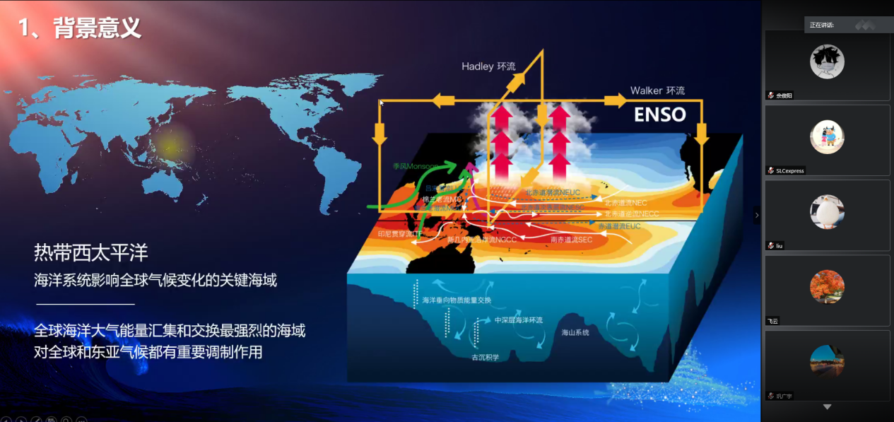 首先,汪嘉宁研究员从物理海洋学角度介绍了热带西太平洋作为全球海洋大气能量汇集和交换最强烈的海域,对全球和东亚气候的重要调制作用,介绍了西太平洋海洋环流和气候观测研究的背景意义。