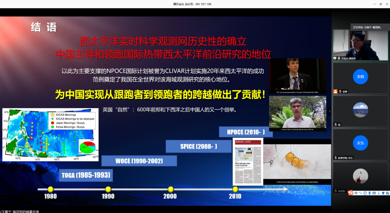 最后,汪嘉宁研究员对西太平洋实时科学观测网建立的意义进行了展示,西太平洋实时科学观测网突破了深海数据实时传输的难题,历史性地确立了中国主导和领跑国际热带西太平洋前沿研究的地位,为中国实现从跟跑到领跑的跨越做出了贡献。