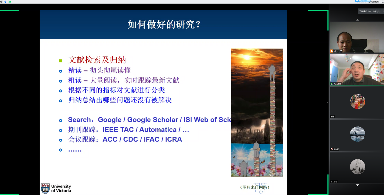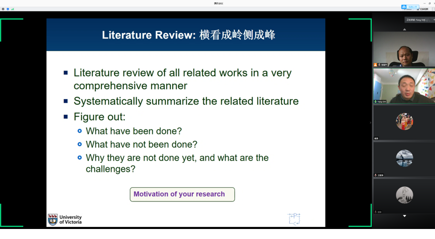 7月3日上午10:30,加拿大维多利亚大学施阳教授应永利集团官网李慧平教授的邀请,为学院师生作题为博士生培养和博士生科学研究方面的线上学术报告会。会议由李慧平教授主持,学校200余名师生参会。报告会从10:30持续到13:00,由两组报告组成,分别为:报告一《如何开展博士阶段的学习和开题》;报告二《如何开展博士阶段的文献综述和科学研究》。