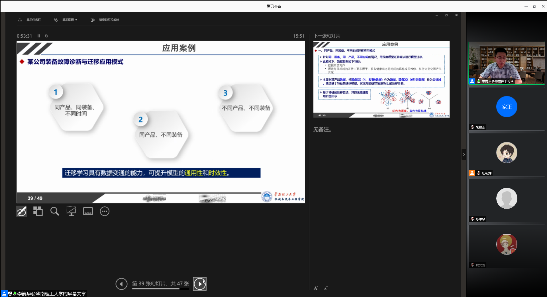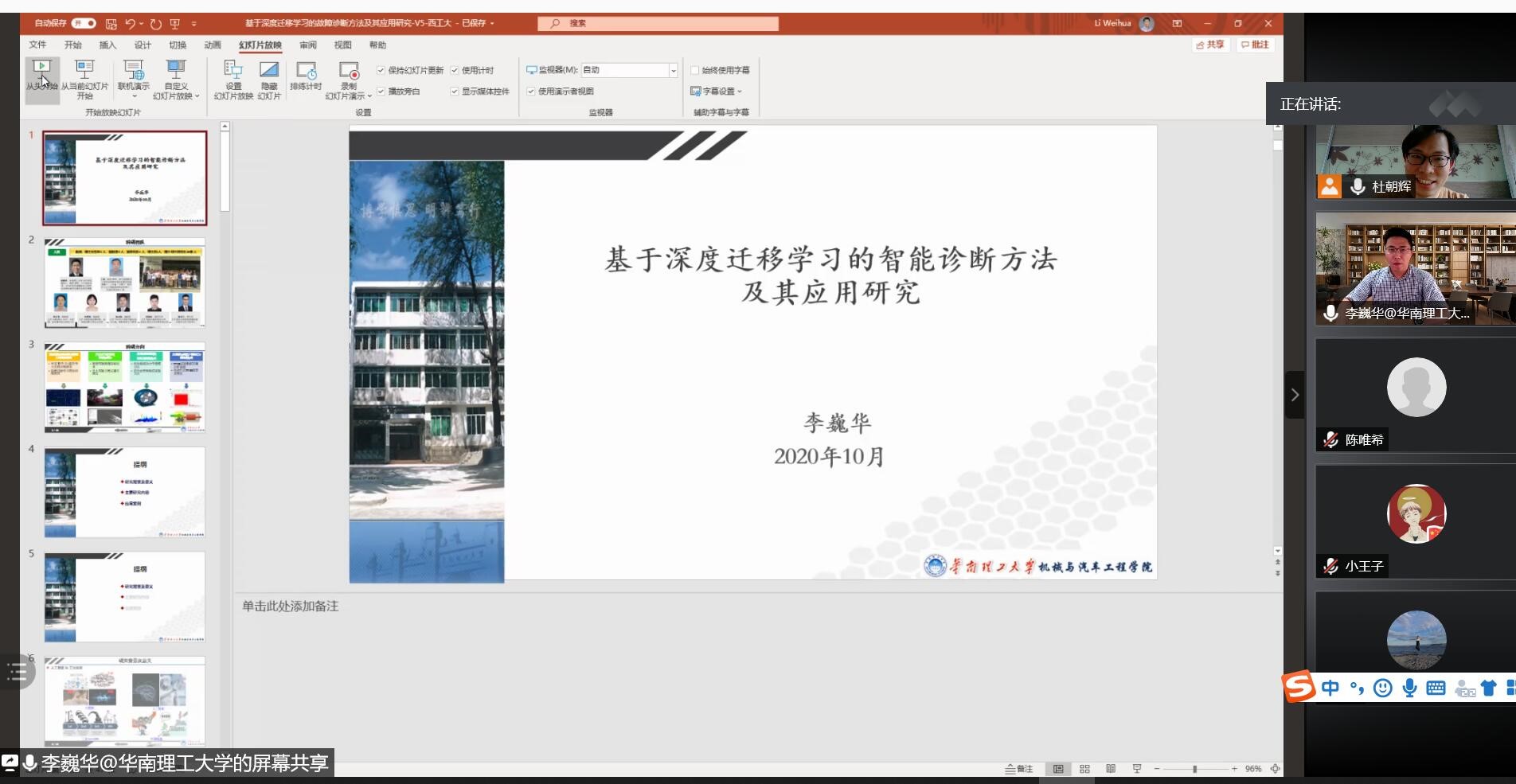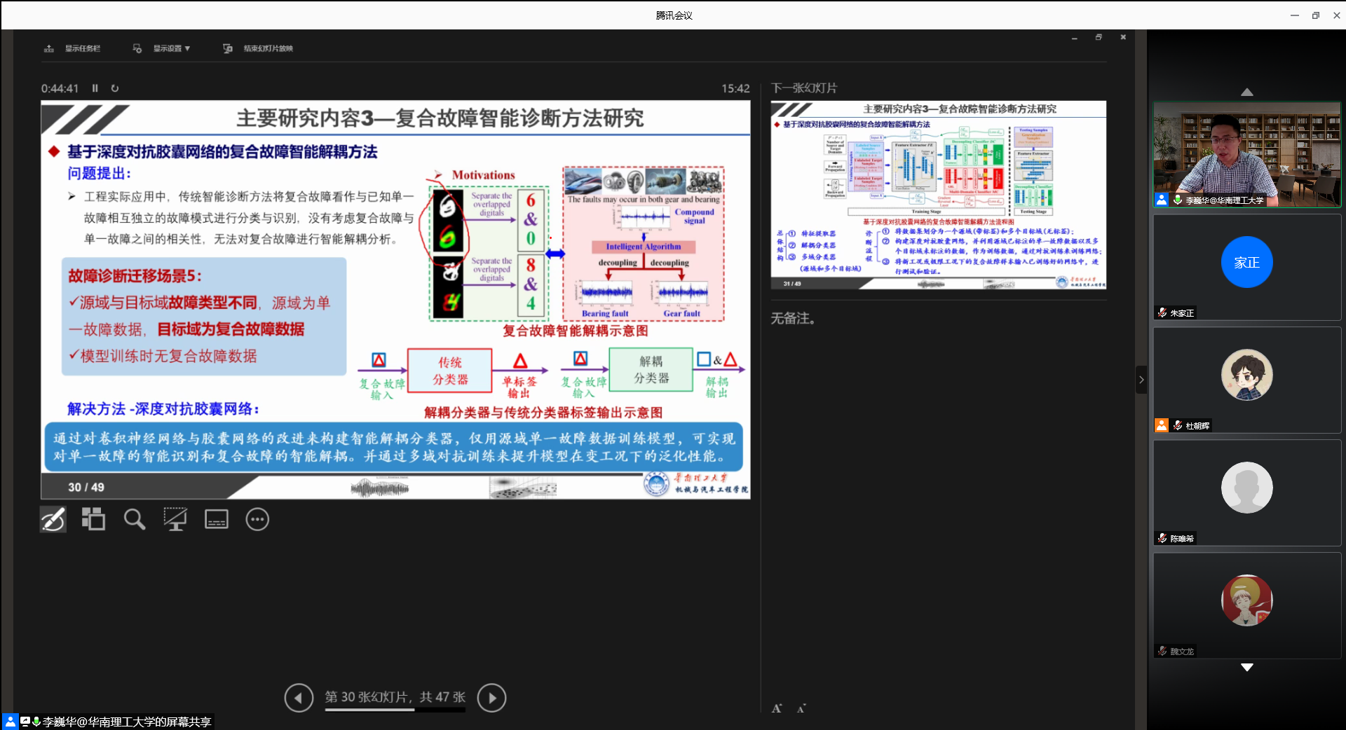 10月14日下午15:30,华南理工大学李巍华教授应永利集团官网杜朝辉老师的邀请,为学院师生作了题目为《基于深度迁移学习的智能诊断方法及其应用研究》的线上学术报告并展开了深入研讨交流。会议由杜朝辉主持,学院30余名老师和学生参加了此次报告会。