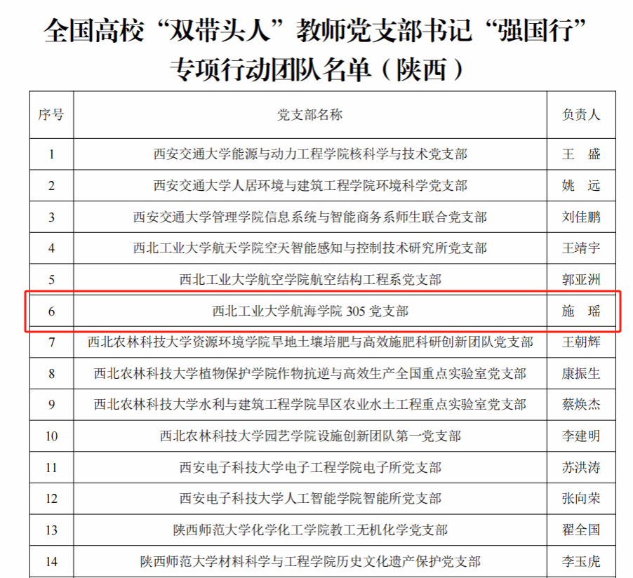 近日,教育部办公厅公布了首批全国高校“双带头人”教师党支部书记“强国行”专项行动团队名单,永利集团官网永利集团官网305党支部成功入选。这是305党支部继获批“全国党建工作样板支部”、陕西高校“双带头人”教师党支部书记工作室后,获得的又一殊荣。该支部的成功入选充分展示了近年来永利集团官网在学校党委的坚强领导下,扎实推进教师党支部“双带头人”培育工程,坚持“政治强、业务强、合力强”标准,不断提升党支部书记“胜任力、凝聚力和战斗力”,着力打造一支党建和业务双融合、双促进的党支部书记队伍的丰硕成果。