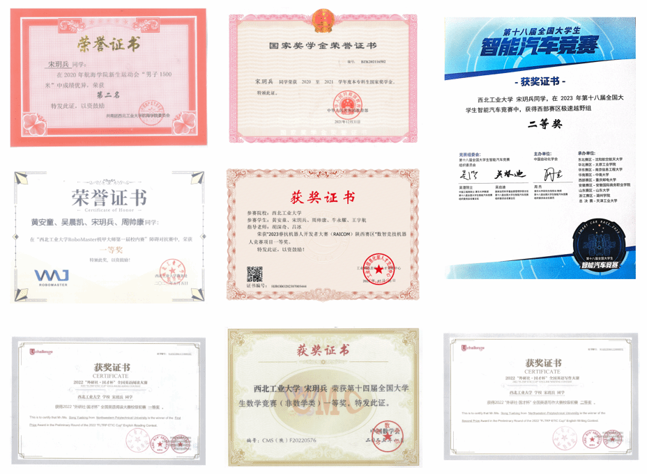 他对科研竞赛有浓厚的兴趣,大二时加入学校智能车基地,担任极速越野组组长,在参加全国大学生智能汽车竞赛的过程中,深入自学PID算法、模糊控制、IMU非线性滤波等知识,最终完成小车全部程序的编写调试工作,申请获得计算机软件著作权登记证书,获第十八届智能车竞赛西部赛区二等奖。大三时参加2023年美国大学生数学建模比赛,自学相关知识,参赛团队最终获得H奖。大三下学期,主动联系加入本校工训中心新成立的水下机器人创新实验室,自2023年3月起担任AUV组组长,负责实验室第一型AUV的研制工作。此外,参与大创项目《基于环境先验信息与红外测距感知的机器鱼自主游动控制策略》并良好结题。